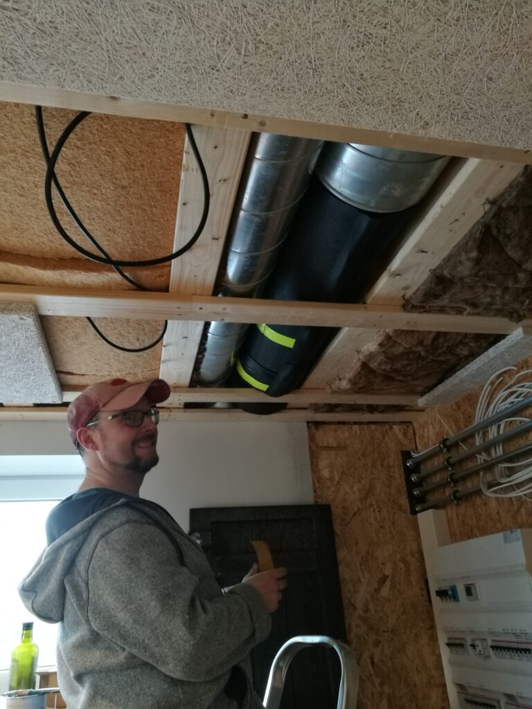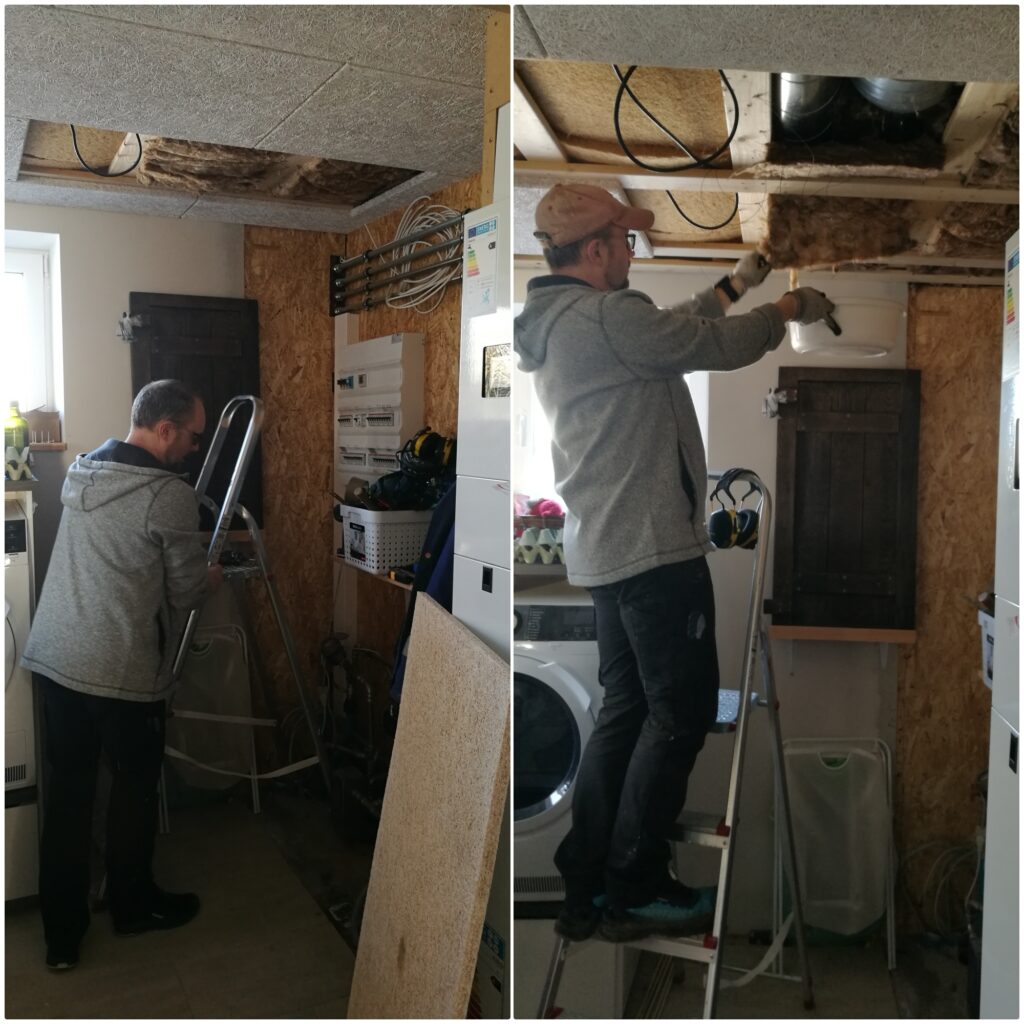 Et af rørene, som går udefra og ind til varmepumpen, havde lidt udfordringer omkring isoleringen. Der var ikke isoleret nok, så Flemming havde fået fat i noget teknisk isolering, som er godt til steder, hvor der ikke er så meget plads. Så lørdag gik med at fjerne eksisterende isolering, som var blevet vådt af kondens; få tørret omkring røret, og tilsidst sat teknisk isolering op. Noget af en opgave som var super rar at få overstået.