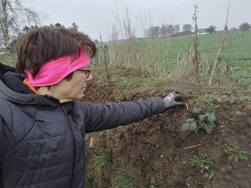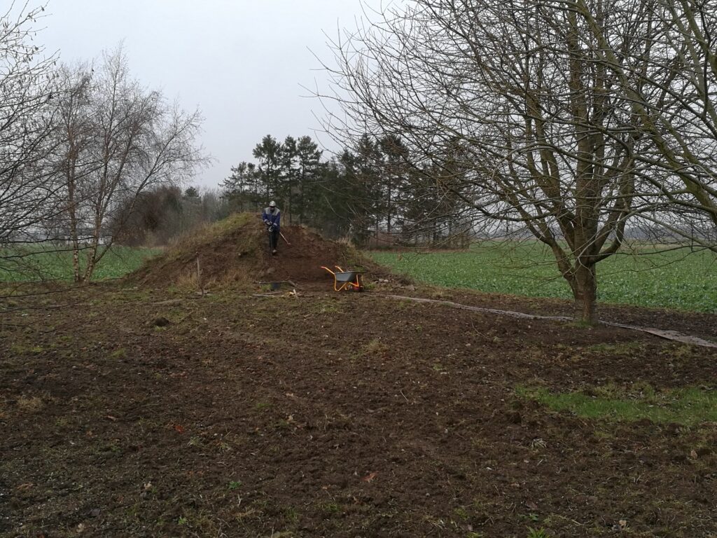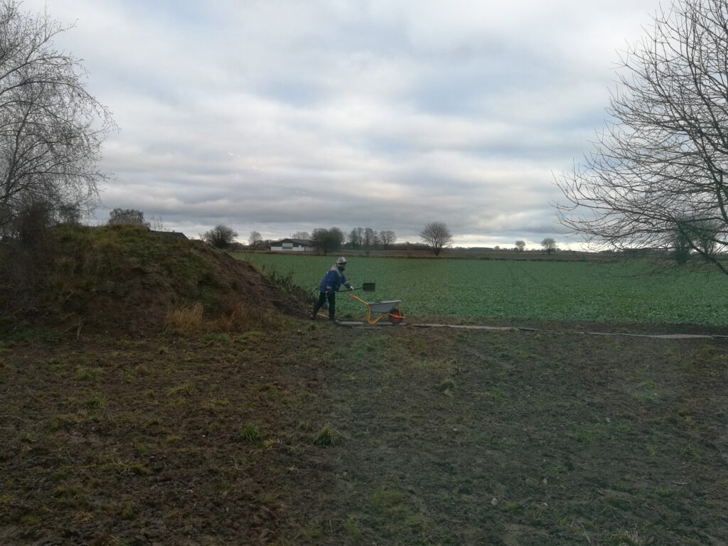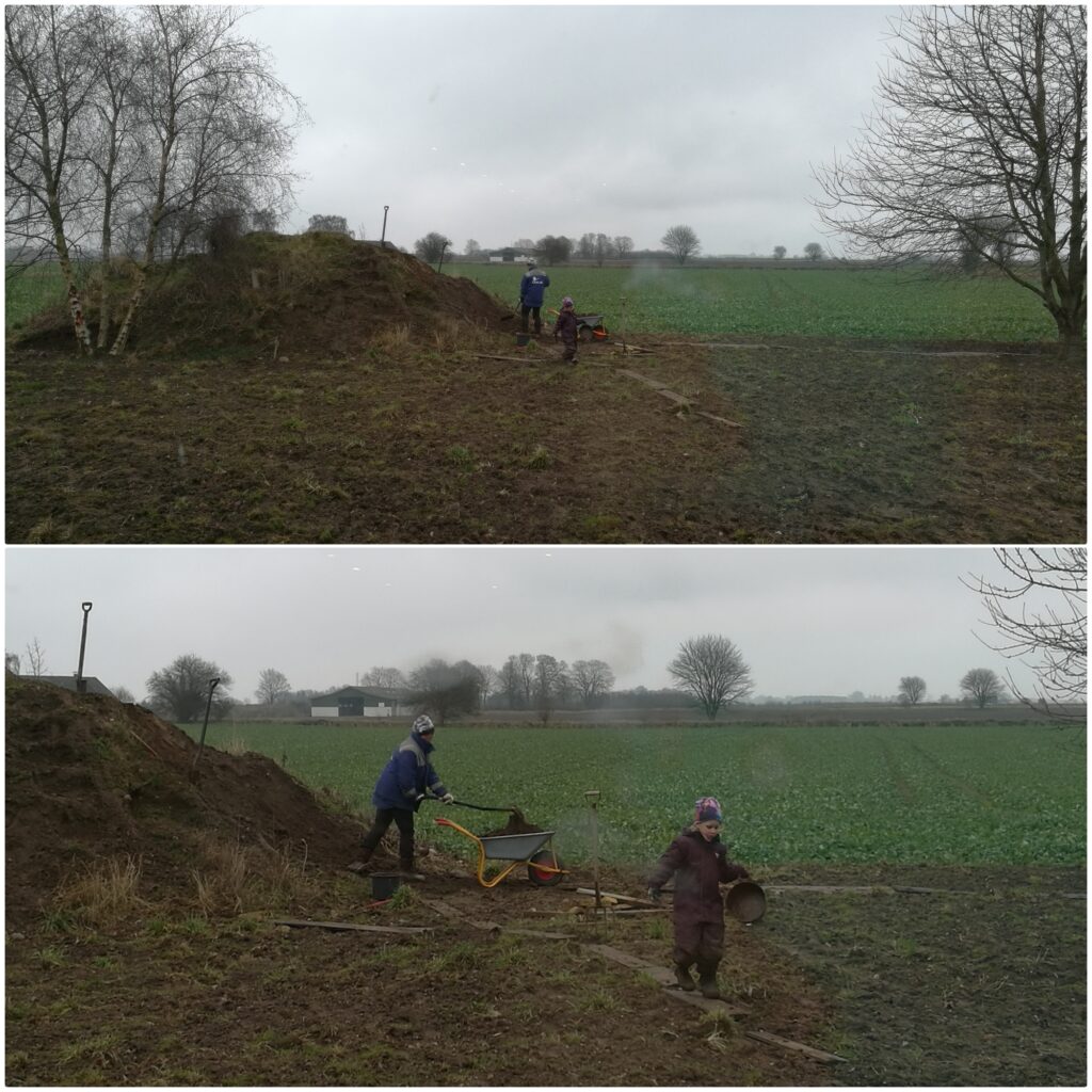 Flemming er i gang med at flytte noget af jorden fra jordbunken og ud, hvor der mangler lidt. Det er gratis og god motion 🙂