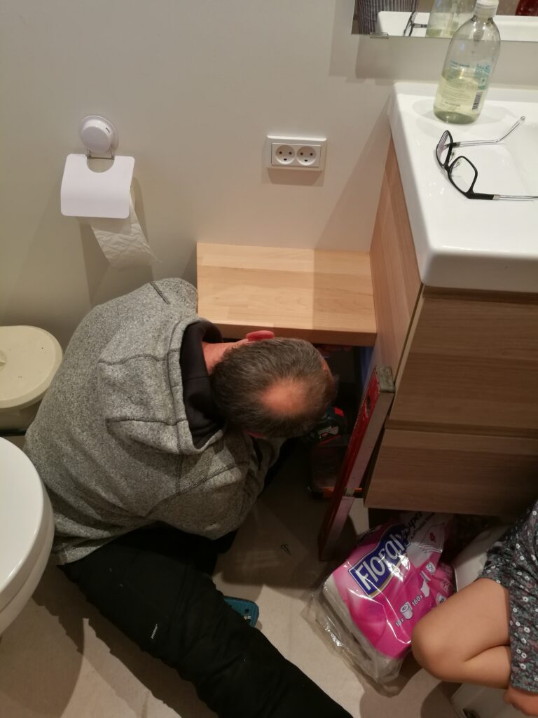I løbet af weekenden fik Flemming gjort en lille bordplade færdig, så han kunne få den hængt op mandag i uge 2. Den er tiltænkt elektriske tandbørster til børnene og hvad der ellers kunne være behov for at have på en sådan ekstra plade.