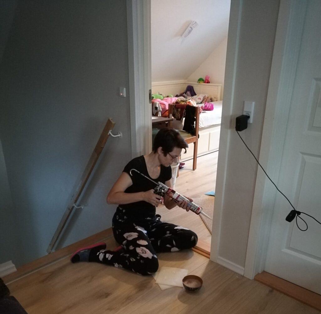 Jeg fik stadig ikke lavet helt så meget grundet min skulder, men jeg fik da fuget lidt omkring døren ind til Mias værelse samt noget af skrå-væggen inde på værelset også. Det er jo det gode ved at fuge – man kan nå en fin del på bare 20 minutter 🙂