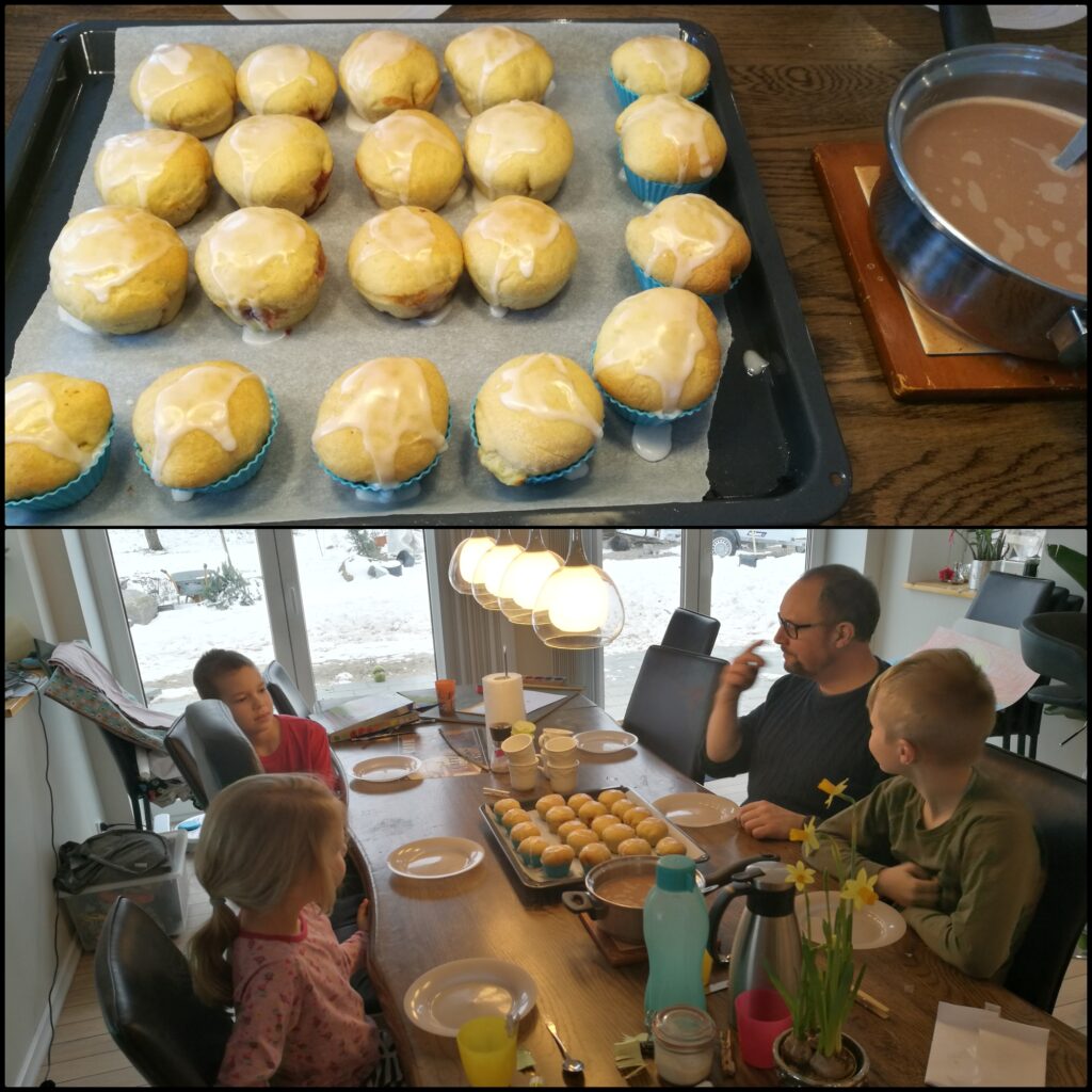 Eftersom vi nærmer os fastalavn, så skulle der selvfølgelig fastalavnshygge til sådan en søndag i uge 5 – hjemmelavede fastalavnsboller med creme, syltetøj og/eller chokolade 🙂 Dertil varm kakao.