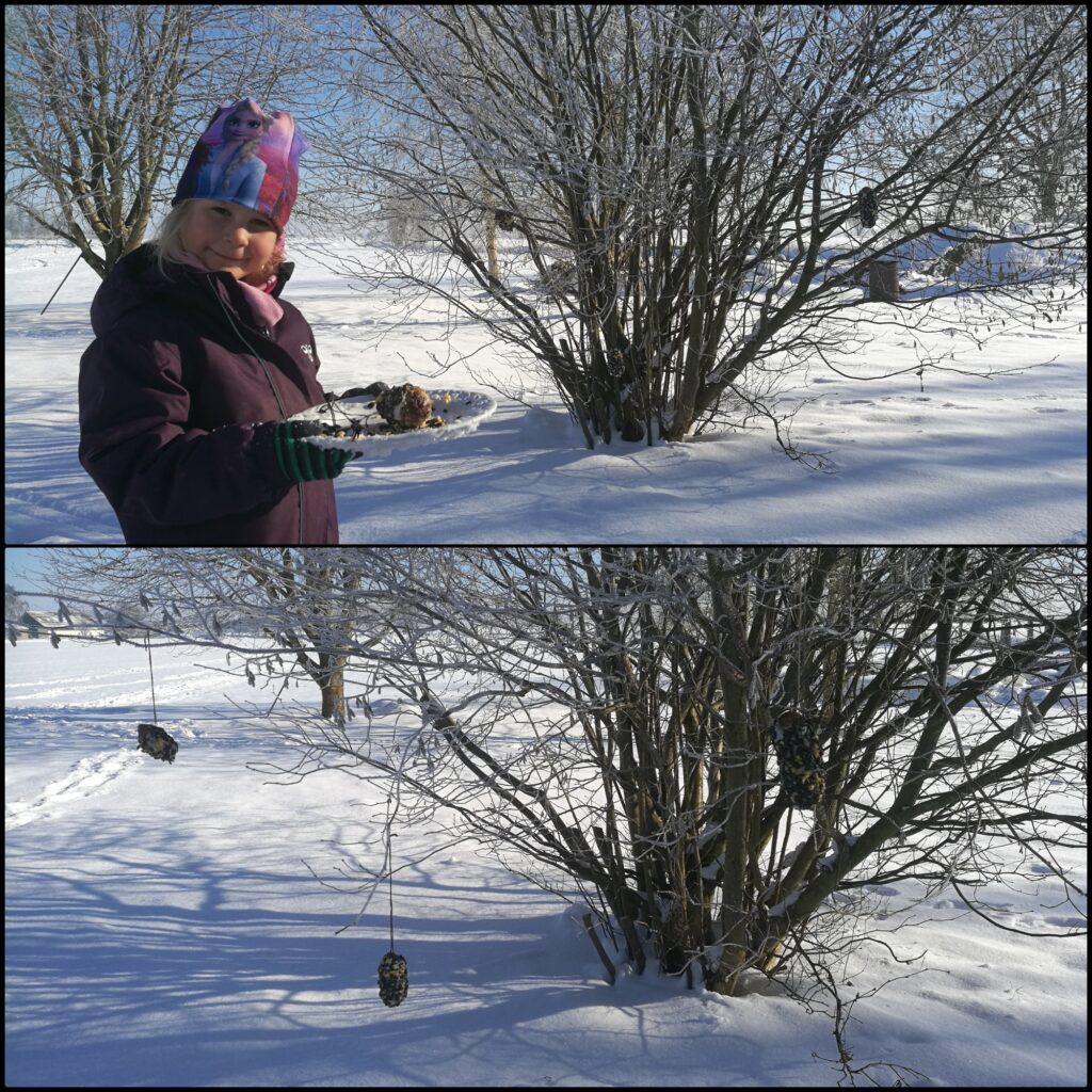 Mia og jeg fik lavet foder-kogler til de stakkels fugle, som jo ikke har nemt ved at finde mad i al den sne. Dem var vi ude at hænge op. Det tog dog lidt hårdt til skulderen, så havde ret ondt det meste af dagen :-S
