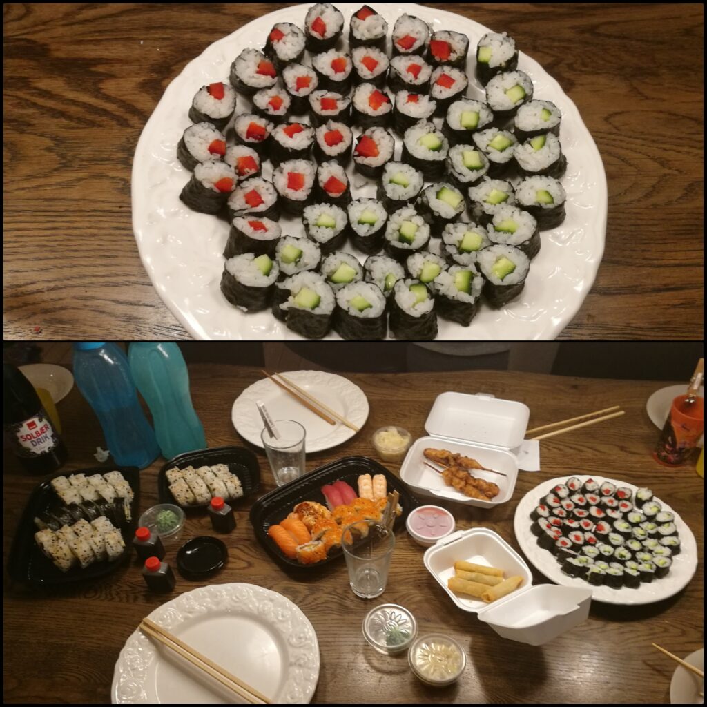 Det var super hyggeligt, og kunne nydes mens jeg fik lavet lidt sushi til de to mindste (som kun vil have de små med agurk eller rød peber i). Flemming var afsted efter sushi til os andre. Vi vurderede, at det godt kunne betale sig at lave noget af sushien selv – for det er noget af en udskrivning, hvis vi skulle købe os alle sammen mætte i sushi 🙂 Kønne er mine sushi’er ikke – men de blev spist rub og stub, så helt skidt var det ikke 🙂