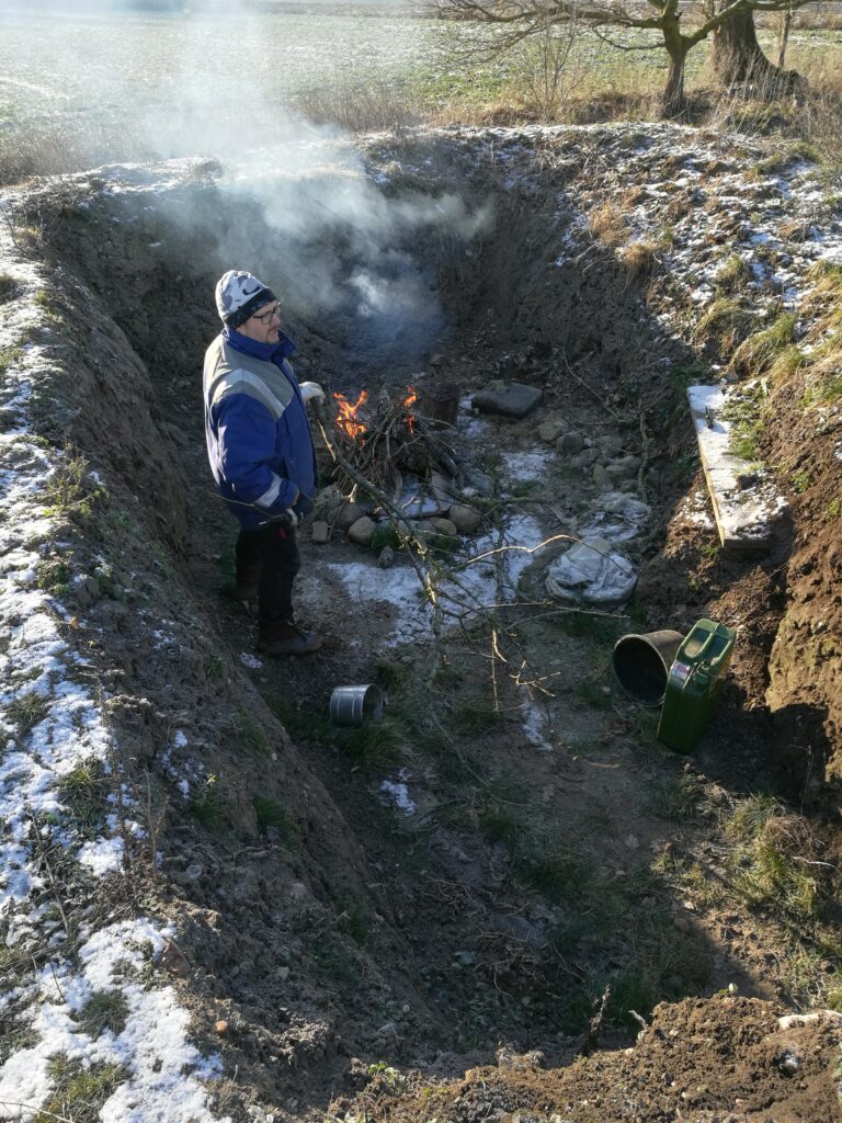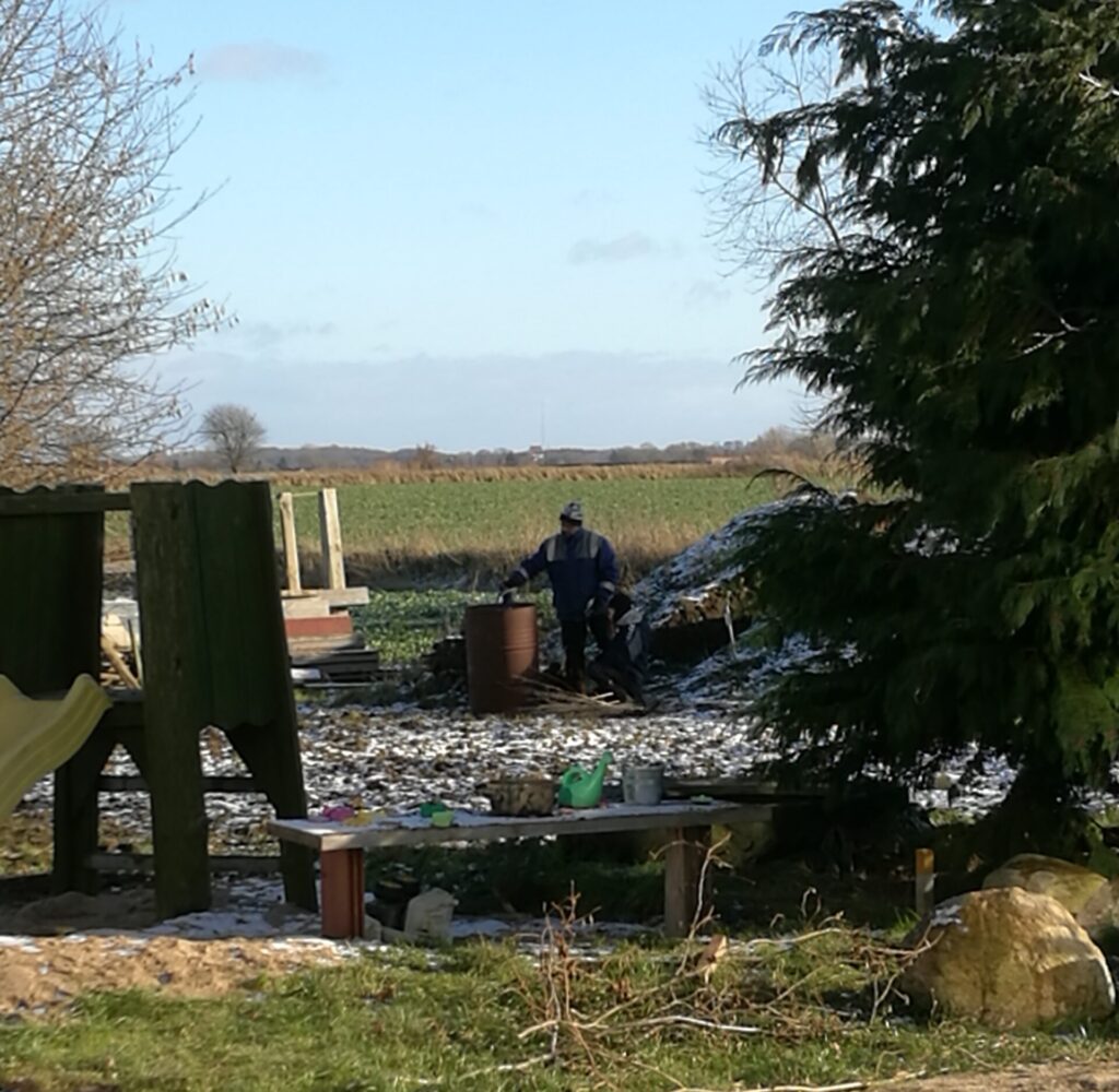 Hos os må man brænde af november, december og januar, hvilket dog kan være ret besværligt, når det hele er vådt. Men i løbet af uge 4 kom vi på frysepunktet, og der kom også en anelse sne – men i hvert fald var det lidt nemmere at brænde af, selvom det tog en rum tid og optændingshjælp til at få gang i ilden. Flemming stod for bålet – så fik børnene og jeg slæbt diverse grene til 🙂