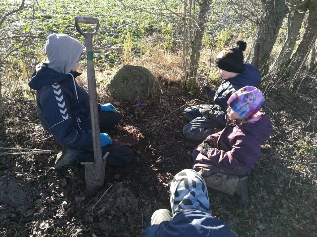 I bålhytten stod en parasolfod – et levn fra i sommers, hvor vi havde en parasol oppe og at prøve og skygge for solen. Under denne parasolfod havde en lille mus lavet sig et lille hyggeligt hjem, som desværre sluttede, da Flemming ville flytte foden, men et øjeblik blev overrasket over at se musen, som så kom i klemme under foden, der blev sat ned igen. Det resulterede i en død mus, hvilket børnene naturligvis blev meget kede af. Så der gik noget tid med at få gravet et hul samt lavet et kors, så musen kunne få en passende begravelse 🙂