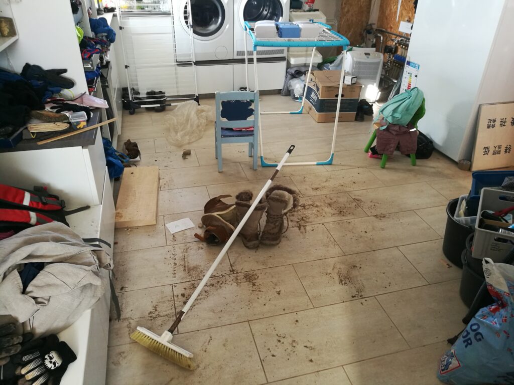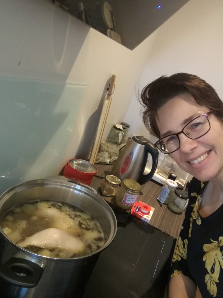 Jeg blev indenfor. Jeg var blevet ret godt og grundigt træt af at se på det kaotiske bryggers, så det gik jeg i gang med at rydde op og gøre rent i. Regn + jord + 6 personer = meget mudder på gulvet! Og samtidig kunne jeg jo se lidt til den hjemmelavede hønsekødssuppe, som jeg havde sat over. Naturligvis med hjemmelavede flûtes 🙂