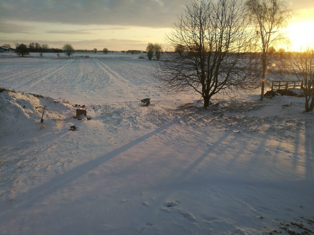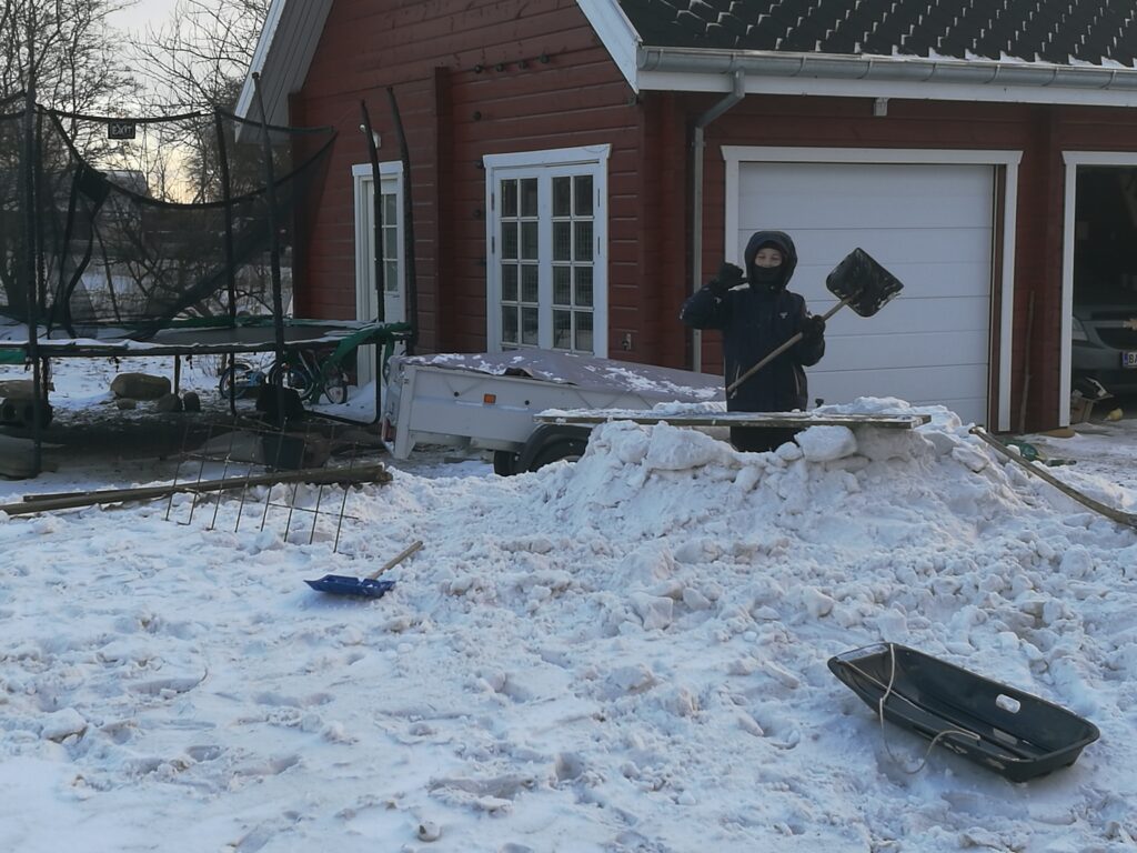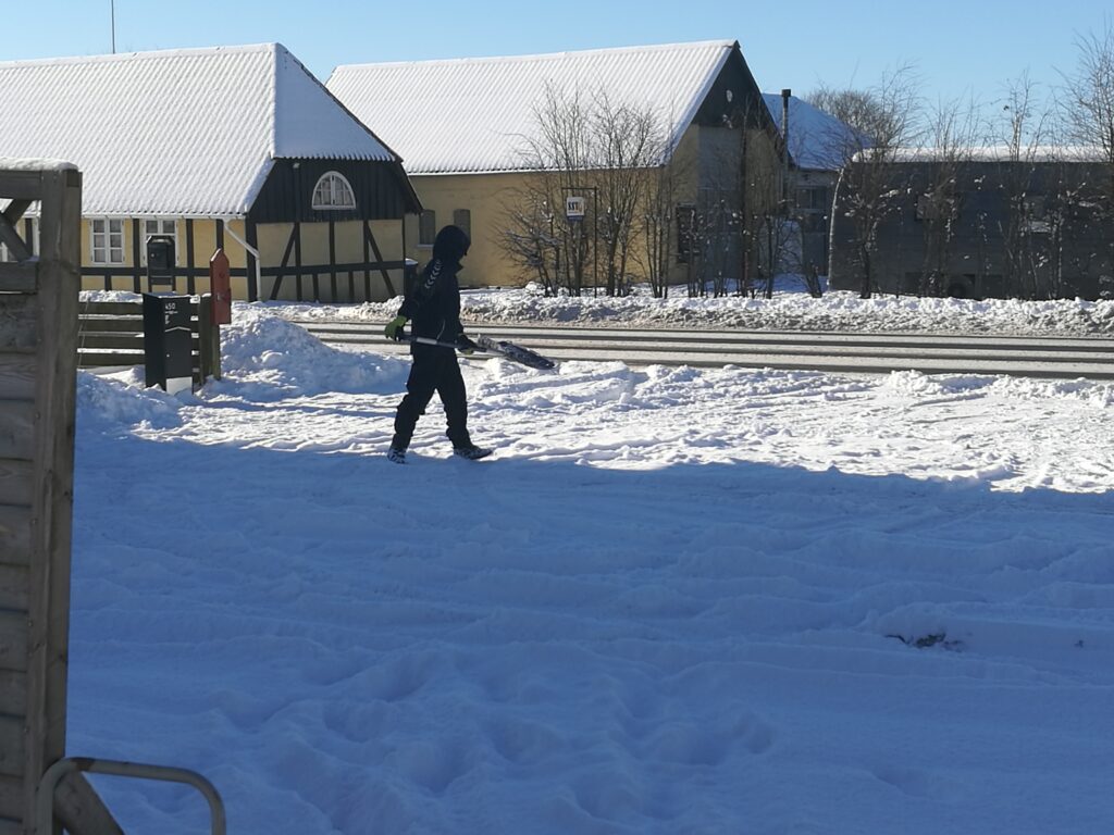 Fredag var en rigtig flot dag – men bidende koldt. Faktisk sagde termometret minus et par og 20 grader, da Flemming kørte de to mindste i skole. Op af dagen steg temperaturen dog, og Theodor var ude og fjerne sne fra noget af indkørslen. Han har idræt om fredagen – så det var hans idrætsopgave 🙂