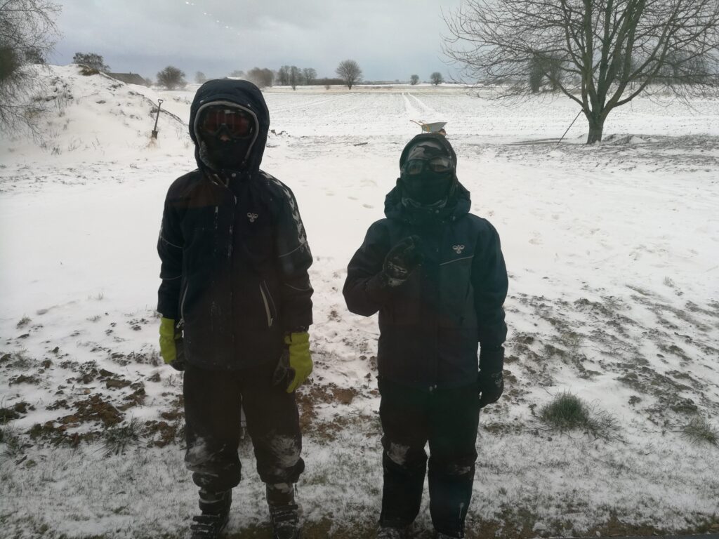 De første par dage var vejret så koldt, at vi hentede børnene kl. 12 fra skole, så de ikke skulle være ude mere end højst nødvendigt. Men når børnene generelt var ude, så var de rigtig godt pakket ind 🙂