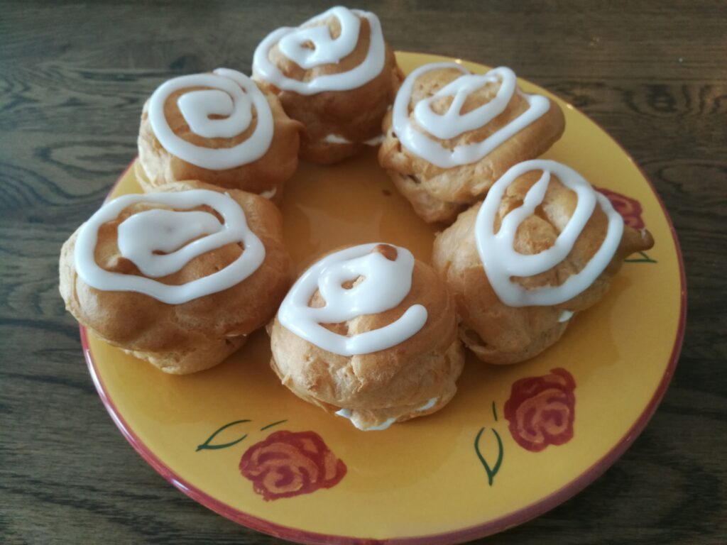 Ugen var for de to store generelt præget af fastalavns-løjer. Og én af dem var, at Theodor skulle lave fastalavnsboller. Jeg hjalp ham naturligvis lidt, og vi forsøgte os med vandbakkelser (første gang jeg har prøvet det…). De blev serveret med creme, syltetøj og flødeskum – og for hulen hvor var de gode!!!!