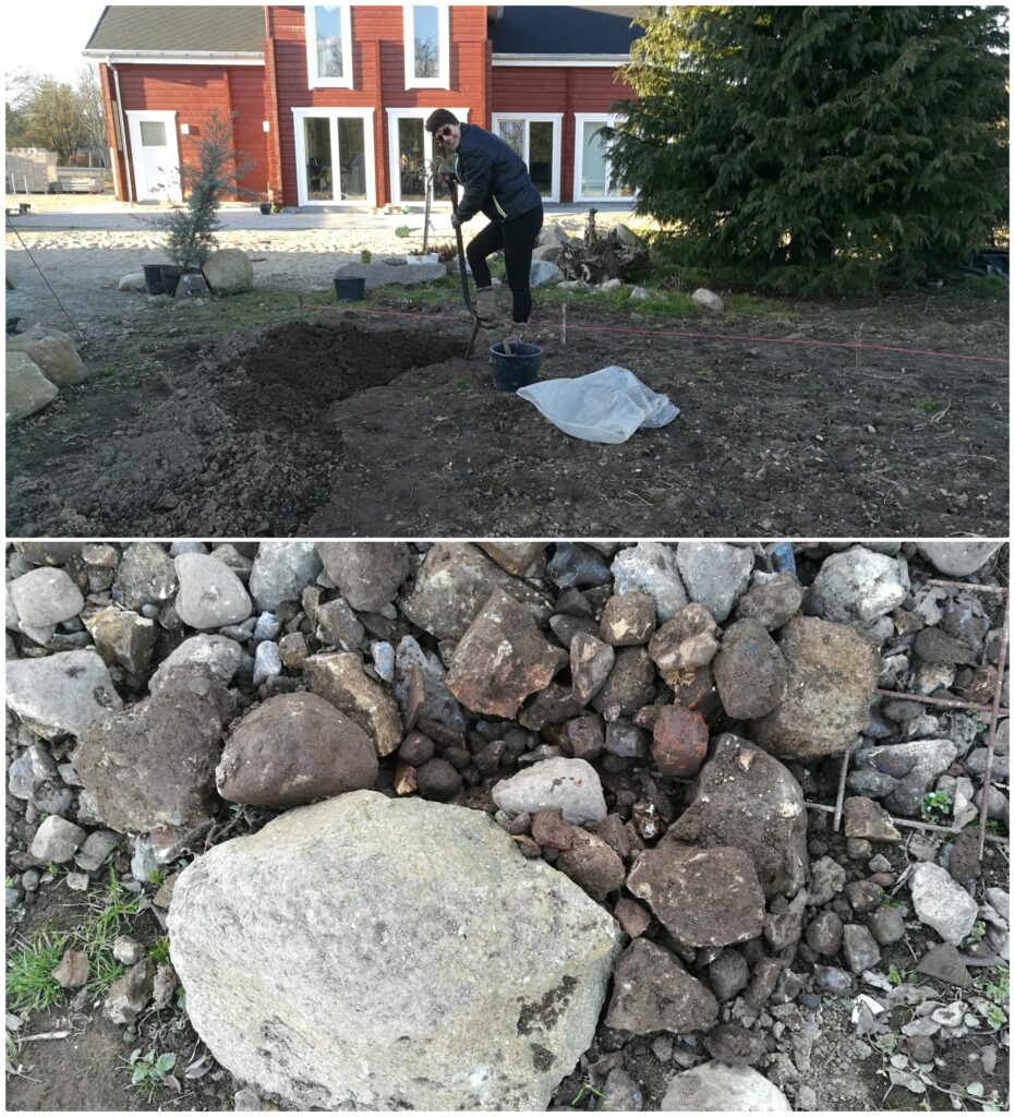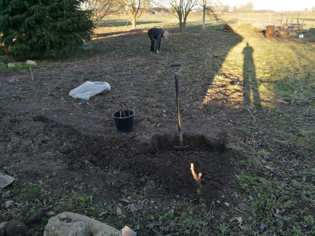 Lørdag var vejret desuden fuld af solskin – men køligt. Jeg fik målt ud til køkkenhaven og startet op på at få gravet jorden godt igennem. Det fik jeg ikke gjordt sidste år, og det trænger. Dertil er der mange sten (og mange store) i jorden, så selvom det er tidskrævende og småhårdt, så er det tiltrængt.