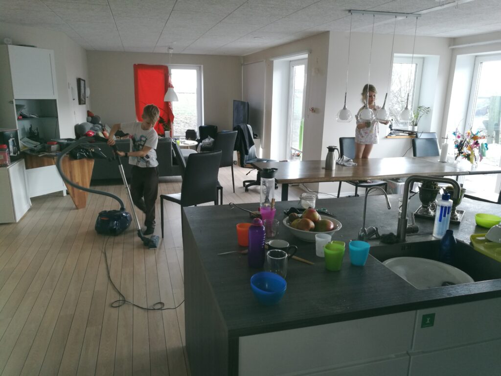 Ikke desto mindre kunne jeg igen lave noget lørdag gik lidt tid med at få ryddet op og gjort rent, og jeg fik inddraget børnene også. Der blev vasket op, tørret støv af, støvsuget, ordnet badeværelser….